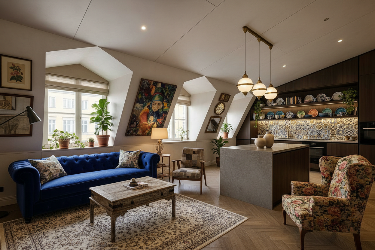 Квартира расположена на мансардном этаже — это пространство тишины, света и уединения. Из окон открывается камерные вид на тихий закрытый дворик исторического центра .
